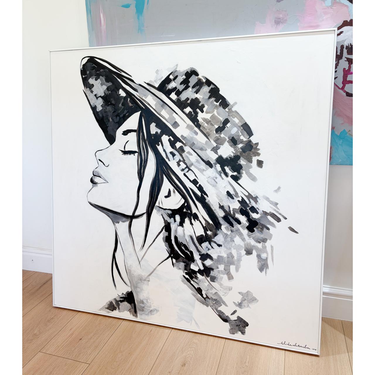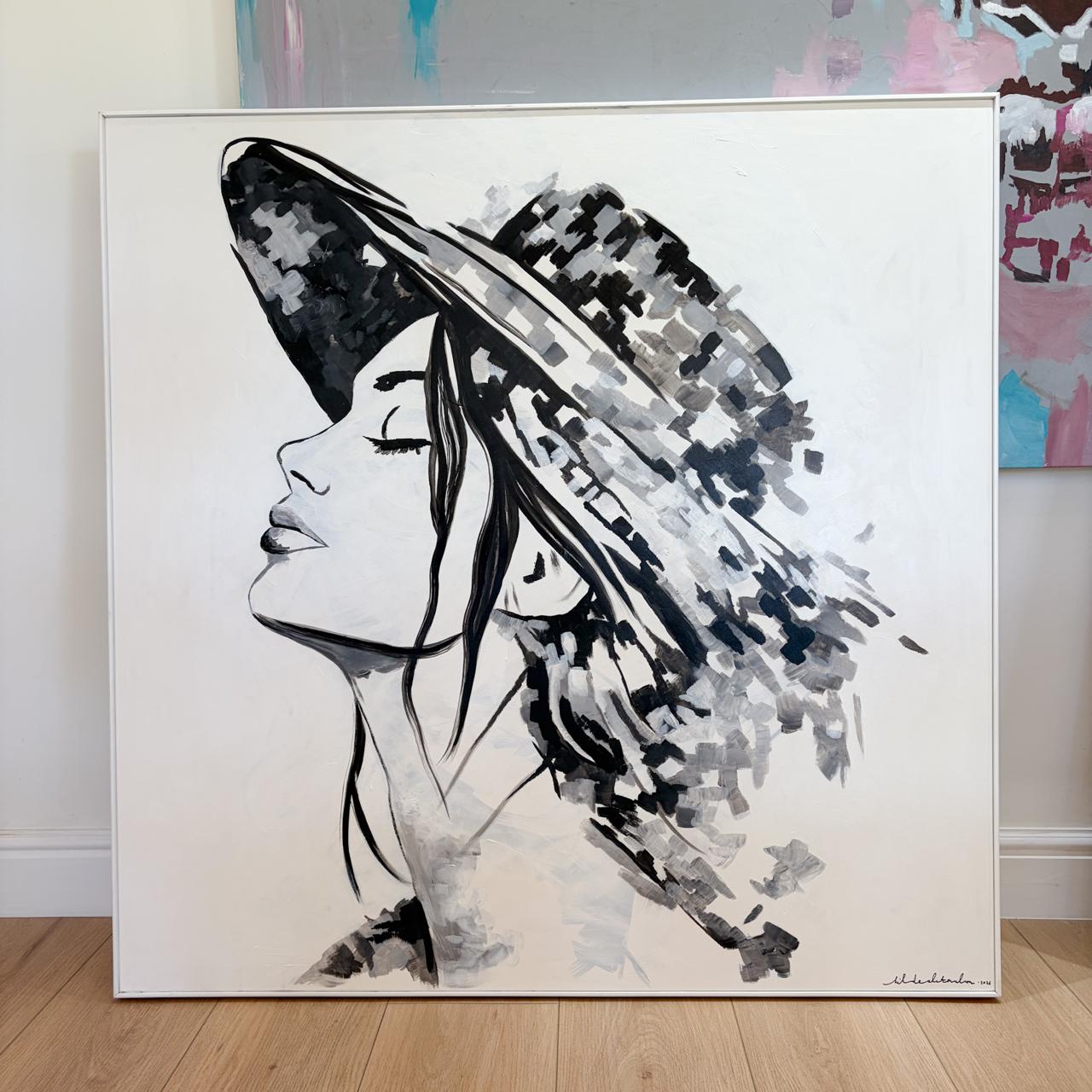 “Between Shadow & Light” is a striking abstract portrait that explores presence, identity, and quiet confidence. The figure — a girl beneath the subtle shelter of her hat — is both partially concealed and powerfully revealed. Through expressive brushwork and the timeless contrast of black and white, the artwork captures a delicate balance between mystery and self-assurance.