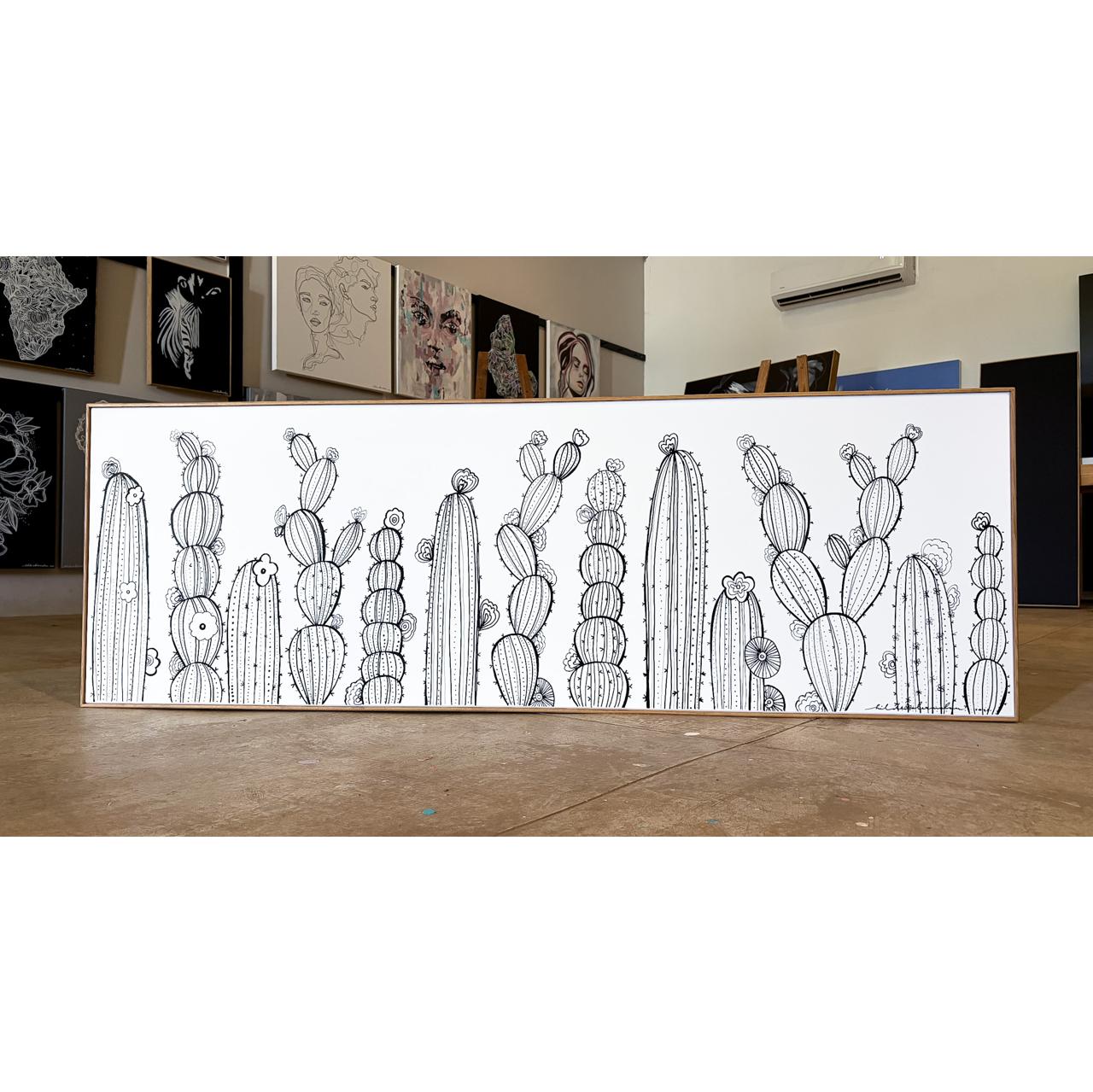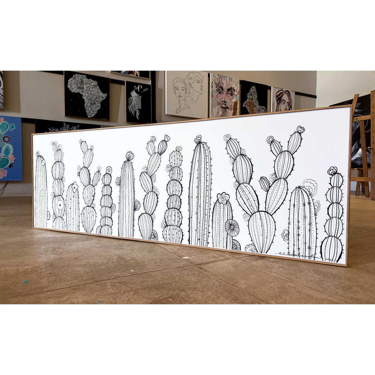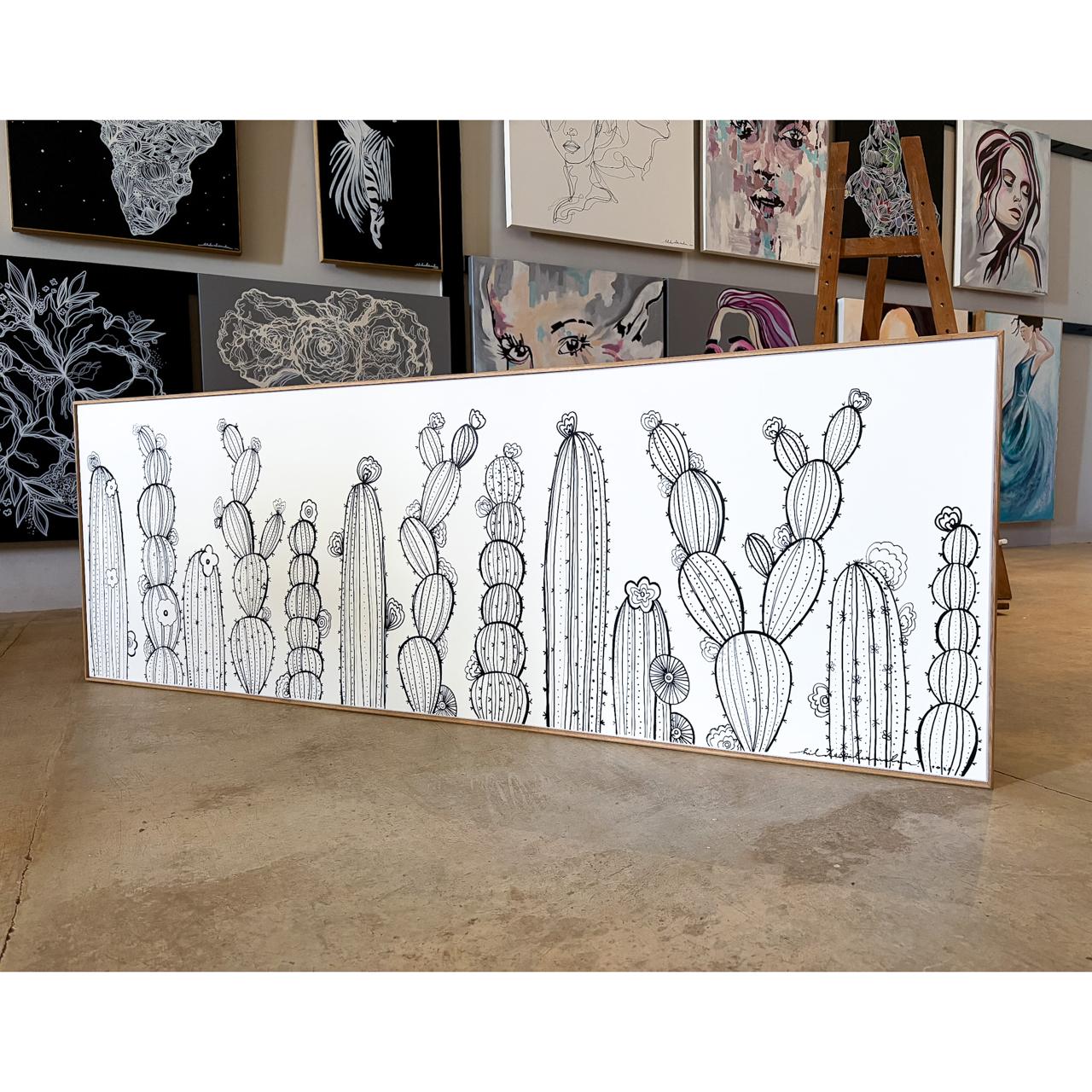 Each cactus is drawn with intentional, delicate detail: tiny blossoms, repeating ridges, gentle curves, and soft shadows created only through linework. These small touches invite you to slow down, look closer, and notice how much beauty exists in the subtle and the understated.