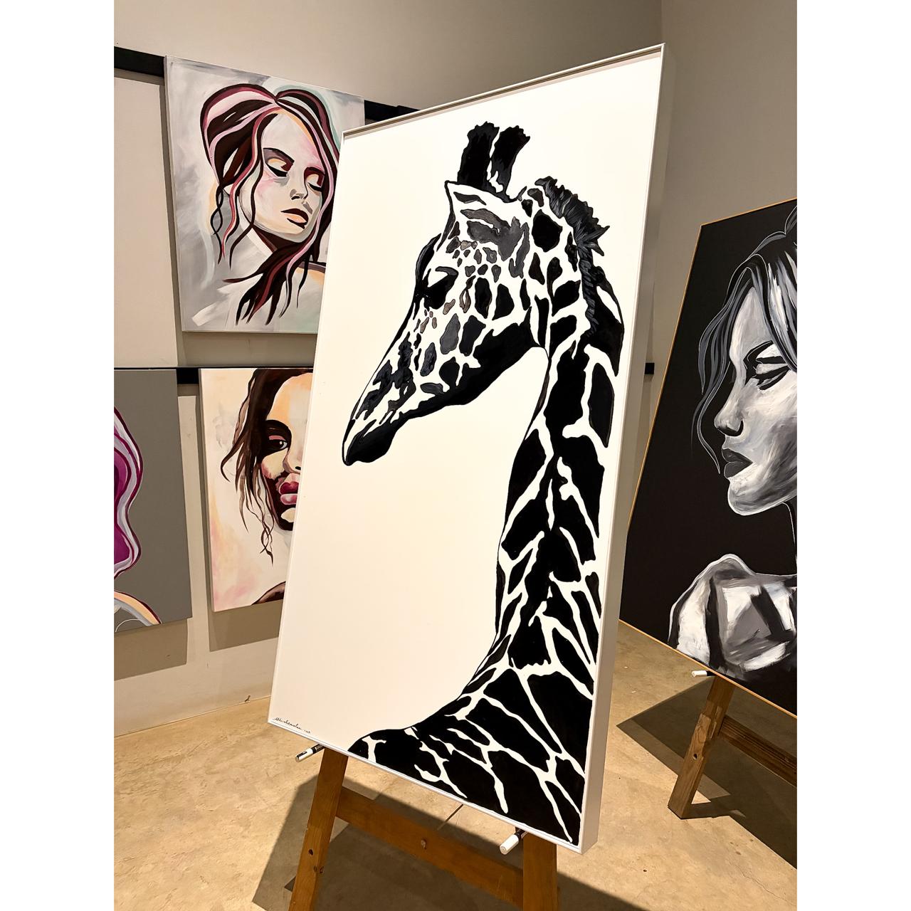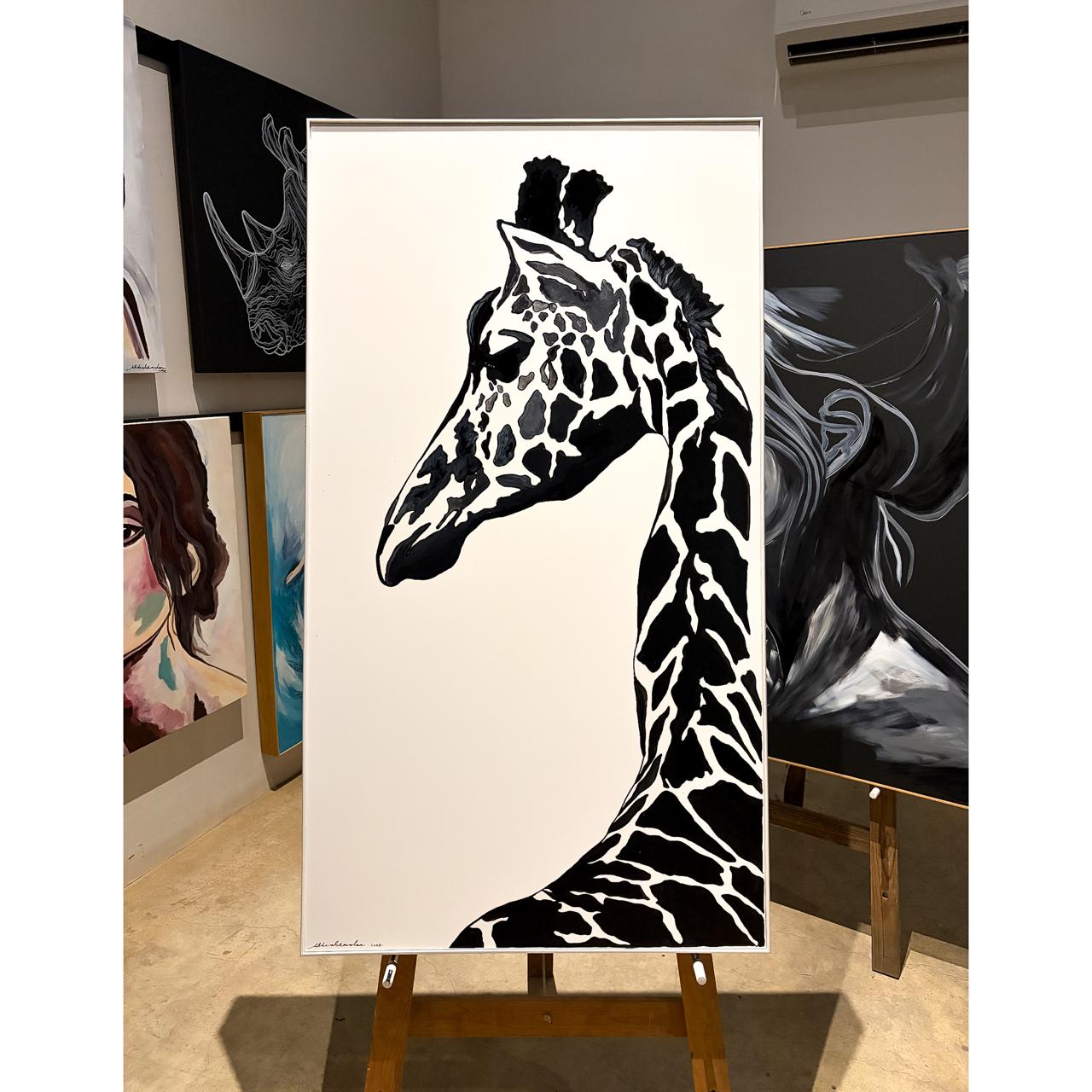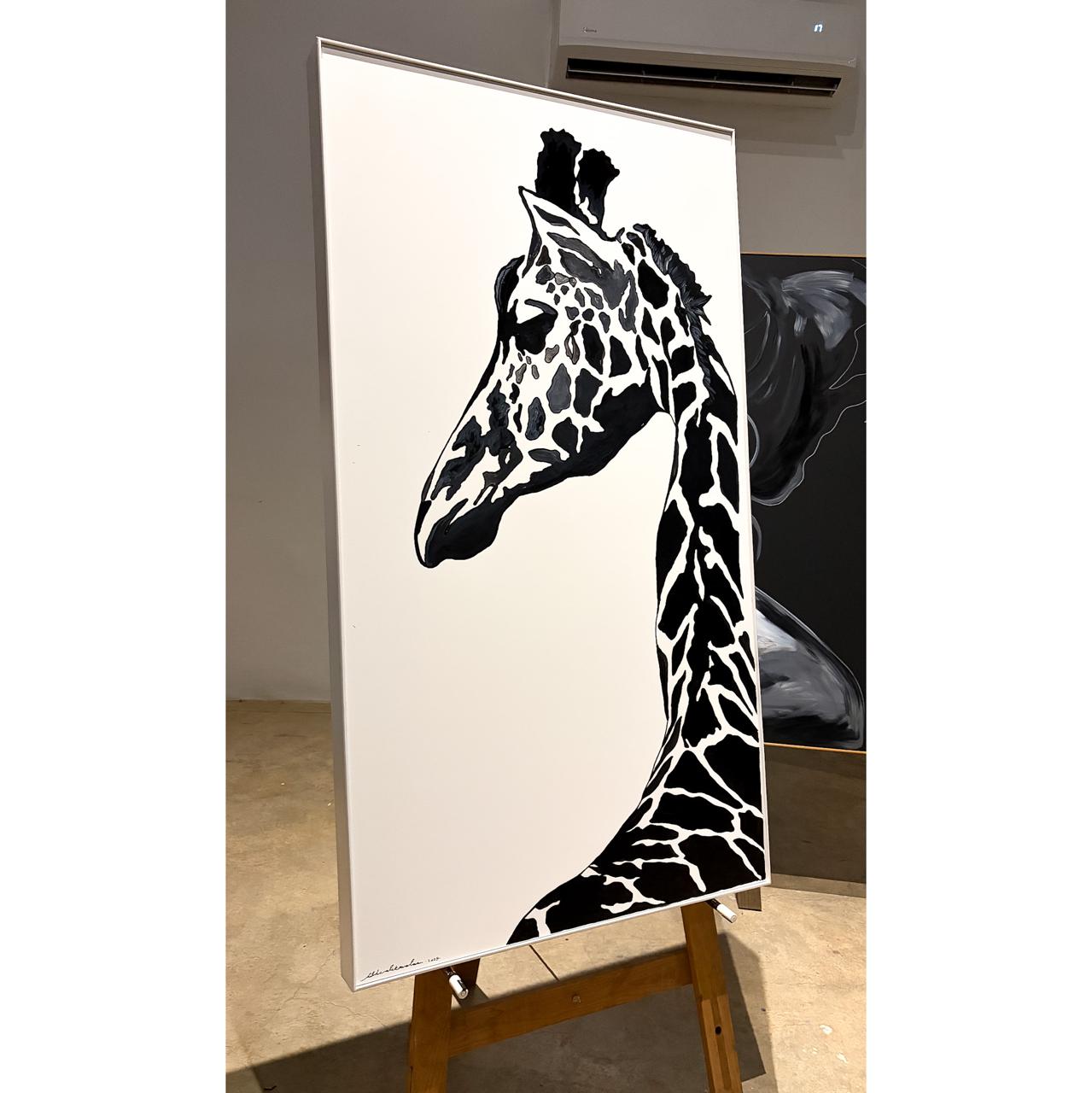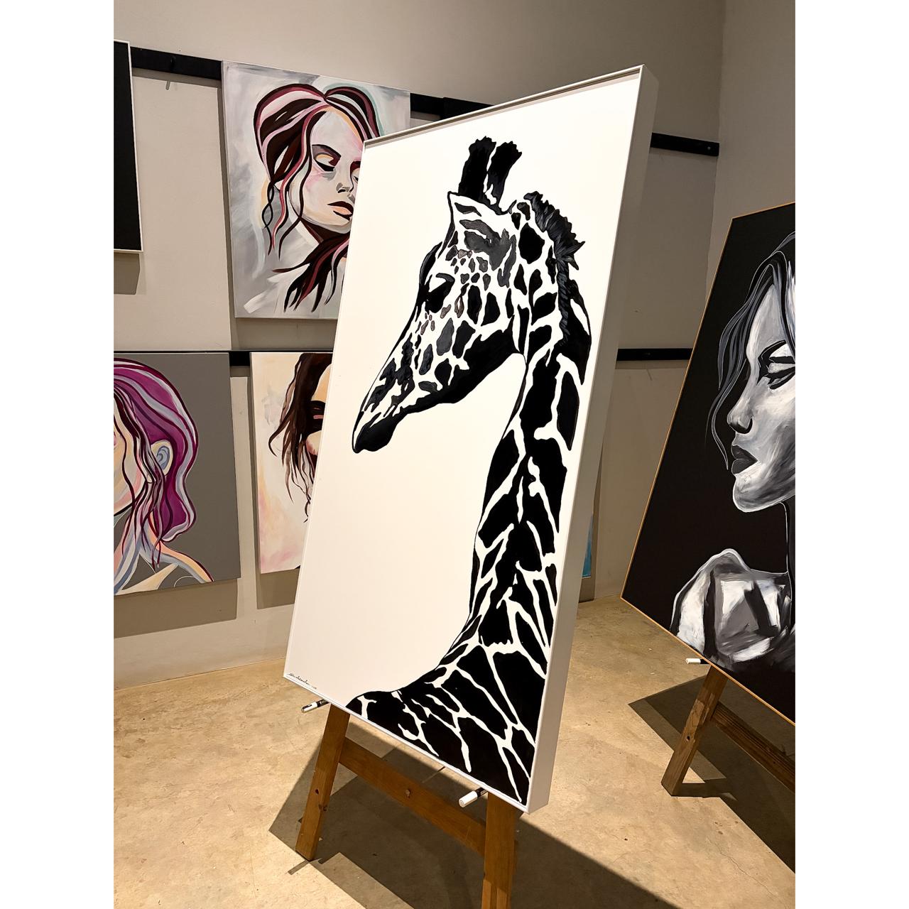 A striking celebration of elegance and presence. This black acrylic ink and paint artwork captures the calm confidence of the giraffe — each mark bold, each curve intentional. Framed in a beautiful white frame and ready to hang, this piece brings sophistication and a powerful statement into any space.