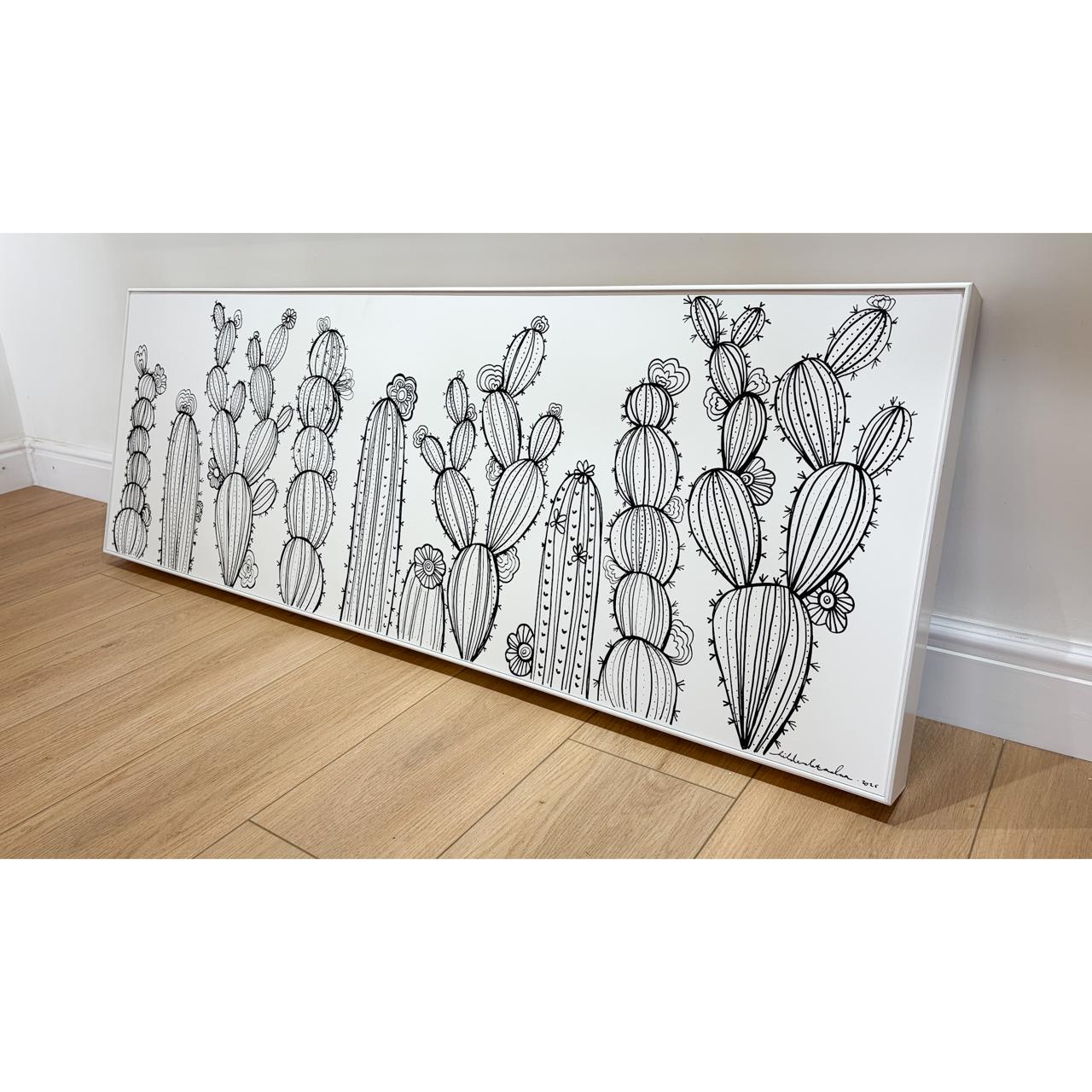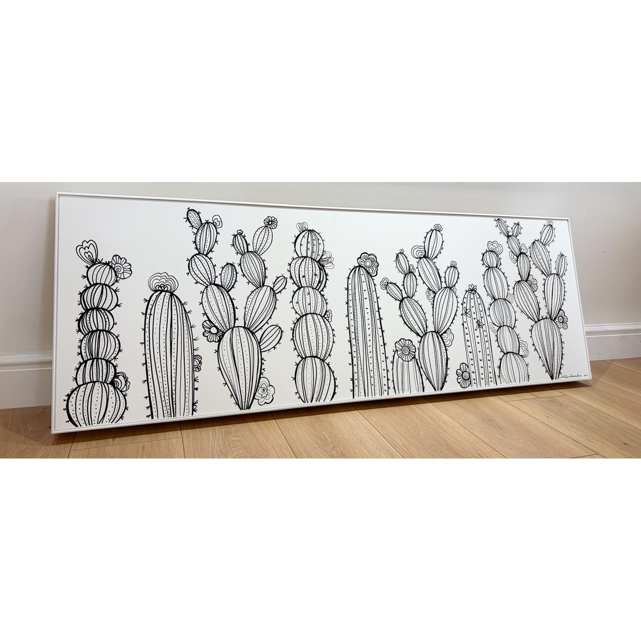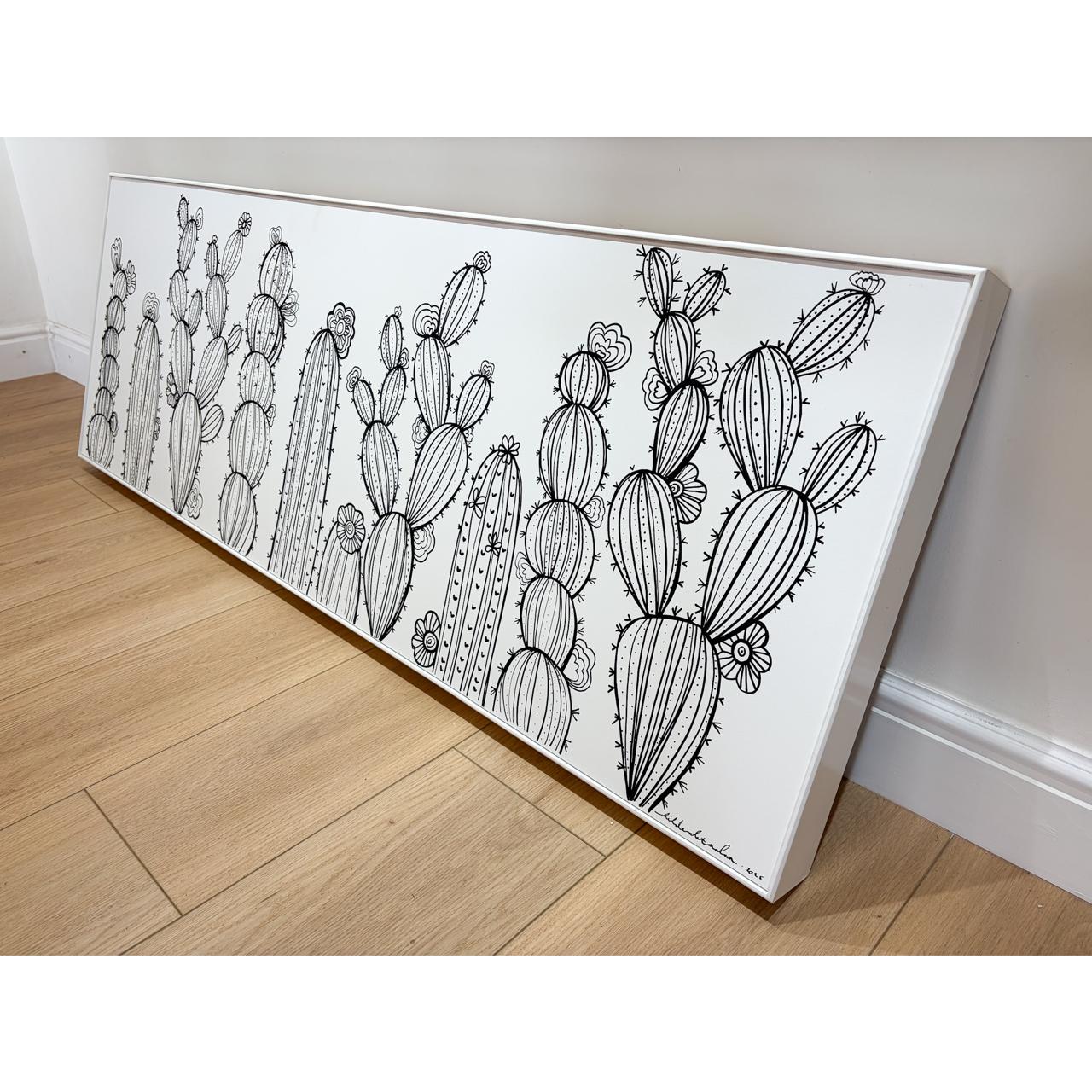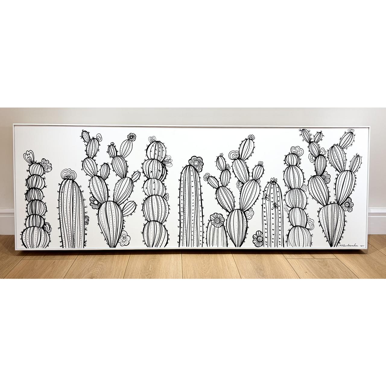 Rendered in bold black acrylic ink on a white wooden canvas, the cactus stands as a symbol of strength shaped by harsh yet beautiful surroundings. The minimalist contrast reflects the raw elegance of the Karoo — where growth is intentional, rooted, and quietly powerful.