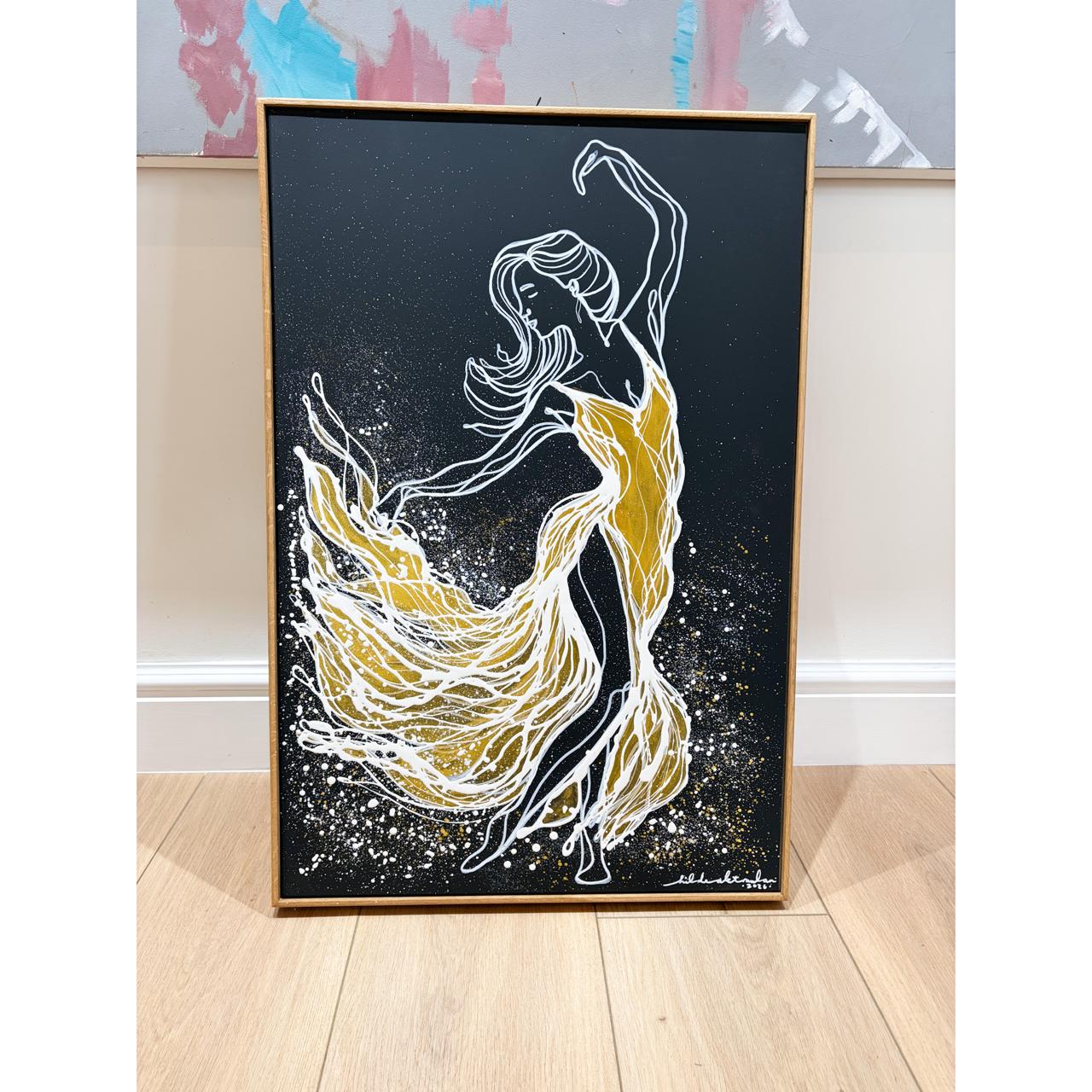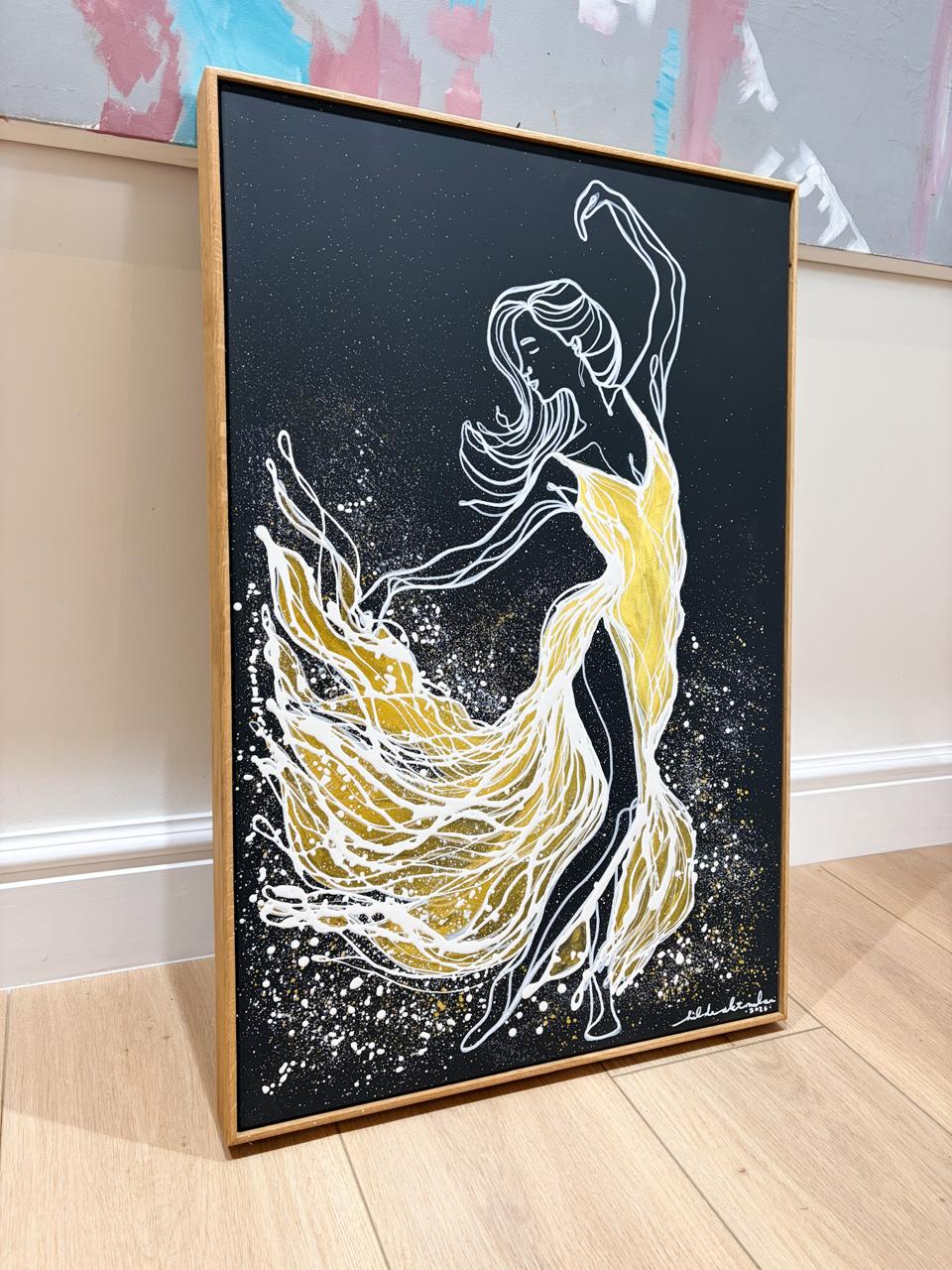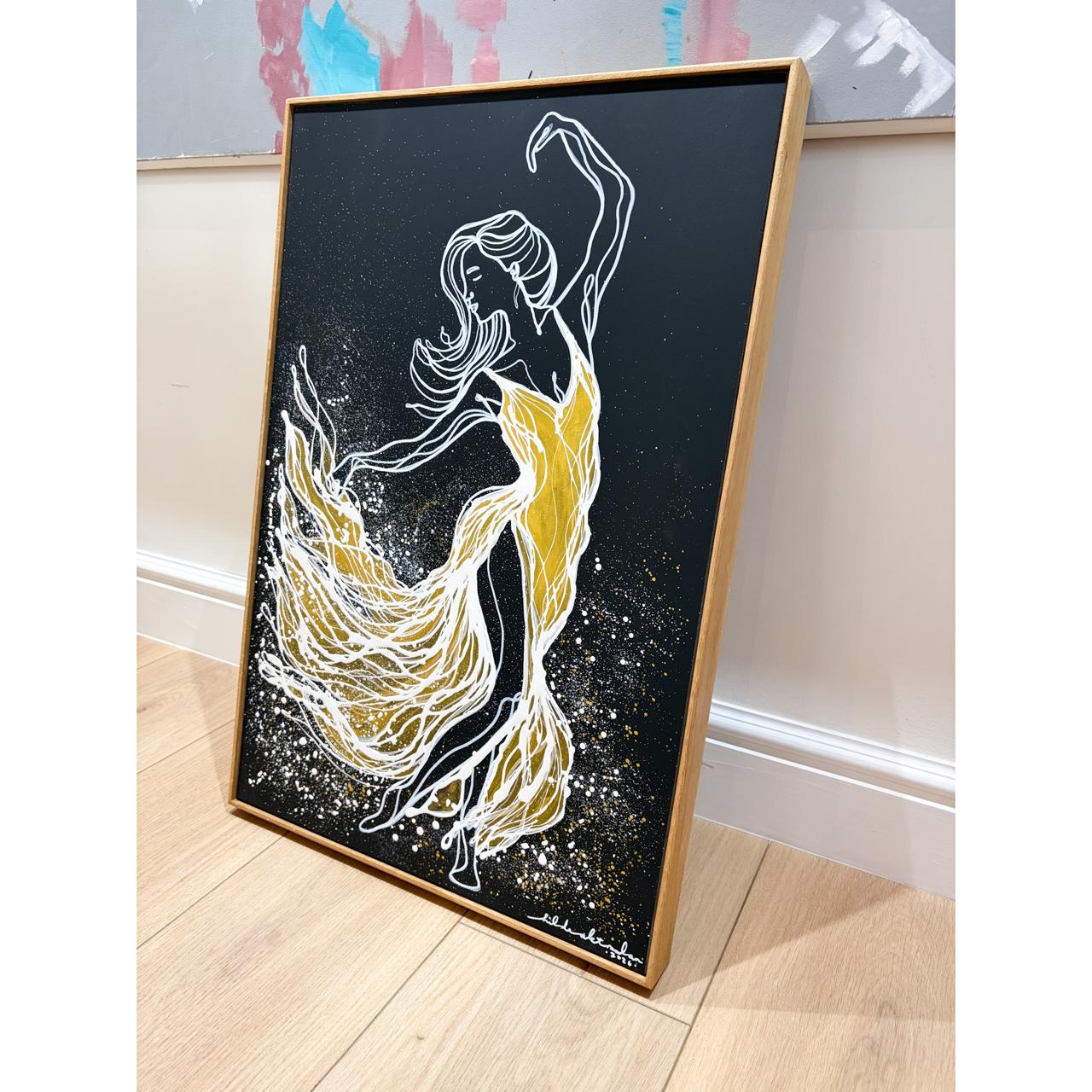 The sweeping movement of the dress suggests freedom — the decision to step forward, to pursue passion, and to live without hesitation. Textural splashes and layered detailing in acrylic ink, acrylic paint, and oil paint create energy and depth, while the natural oak frame adds warmth and balance to the dramatic contrast.