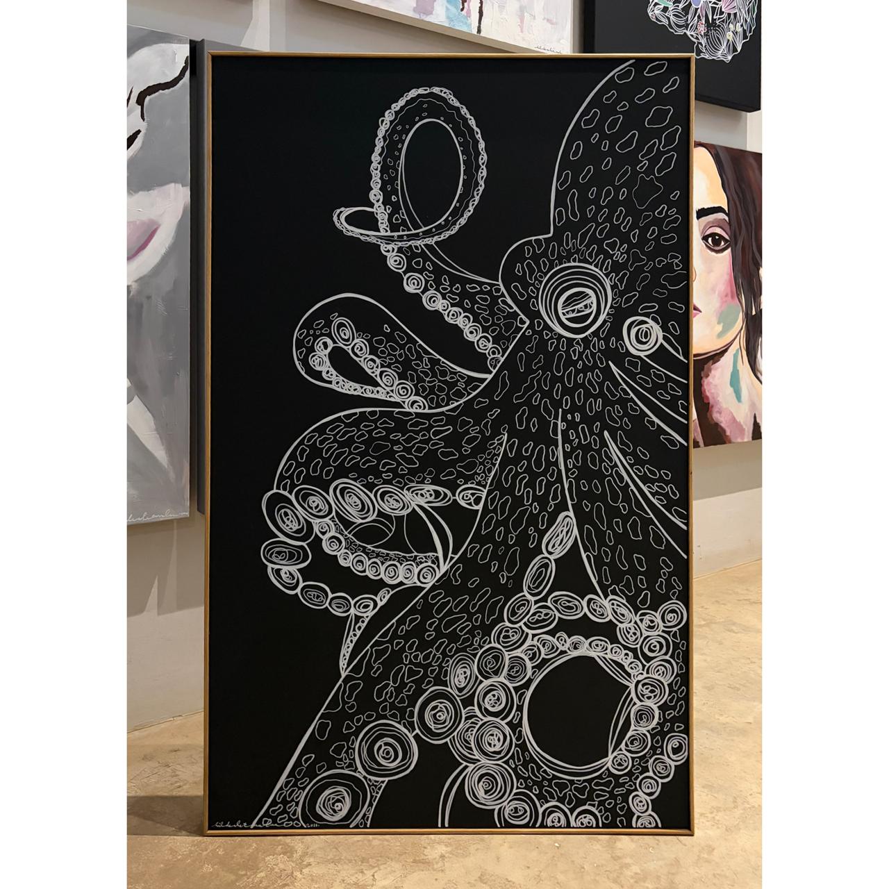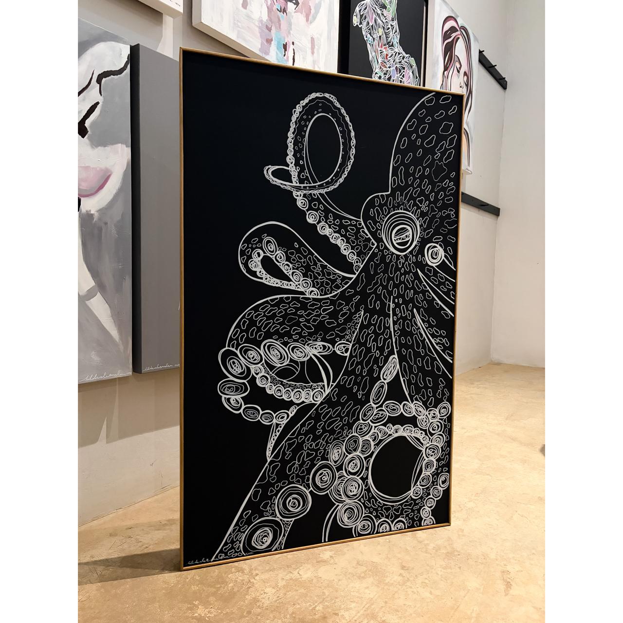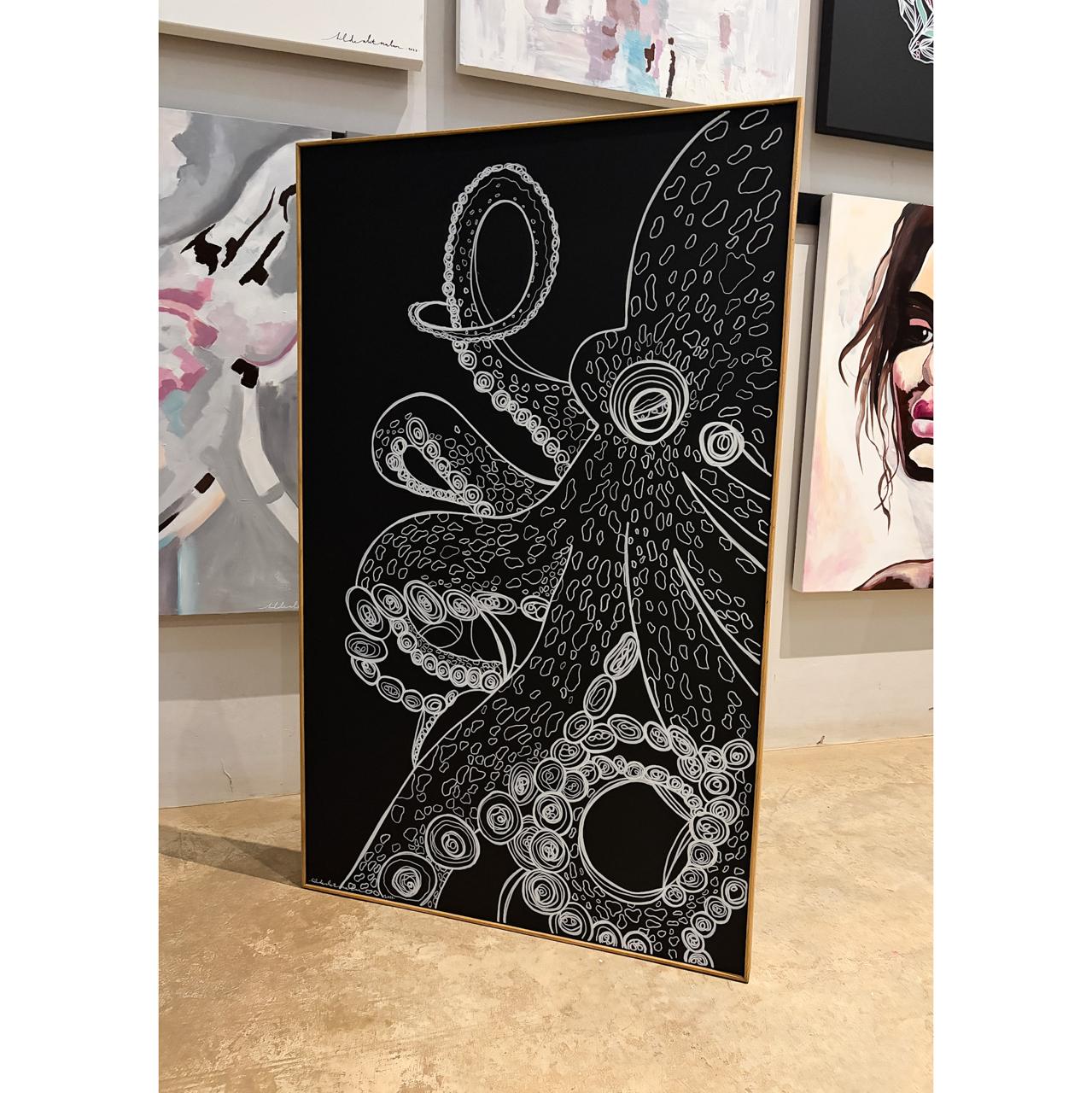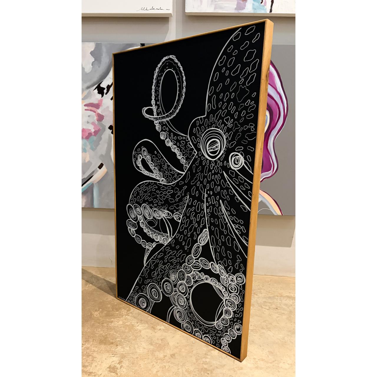 The Stillness Beneath is an 80 × 130 cm exploration of the ocean’s quiet intelligence — a world where life moves with intention, rhythm, and effortless grace. Created with white acrylic ink on a deep black wooden canvas and framed in natural oak, this artwork reveals the intricate form of an ocean creature that usually lives hidden from the light.